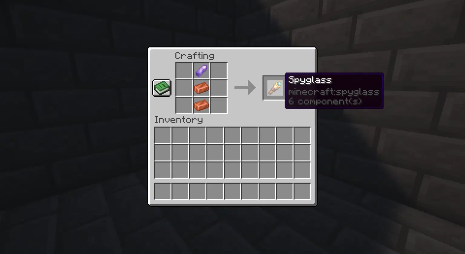 The spyglass is a tool the is crafted with one amethyst shard and two copper ingots. You place these three items in a vertical line with the amethyst shard on top and the two copper ingots on the bottom two spaces.