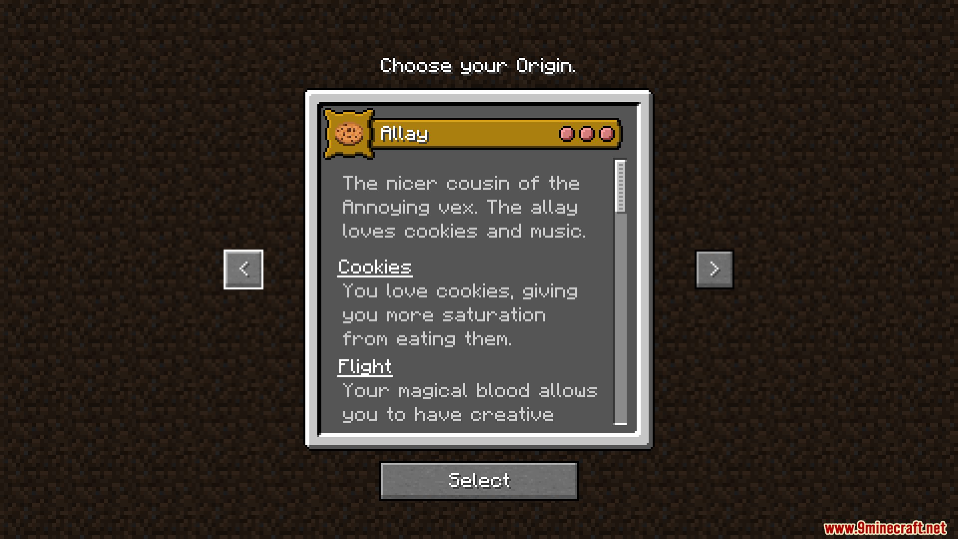 - Allay origin adds abilities inspired by the Allay mob, focusing on utility and support.