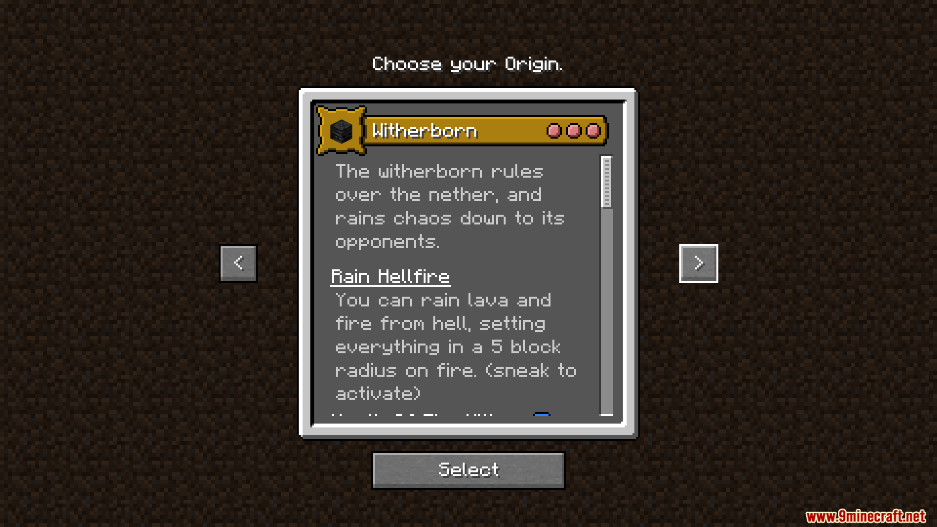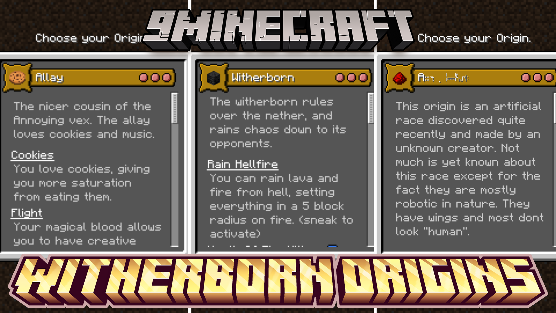 - Witherborn origin is based on the wither skeleton, with powers suited to the Nether.
