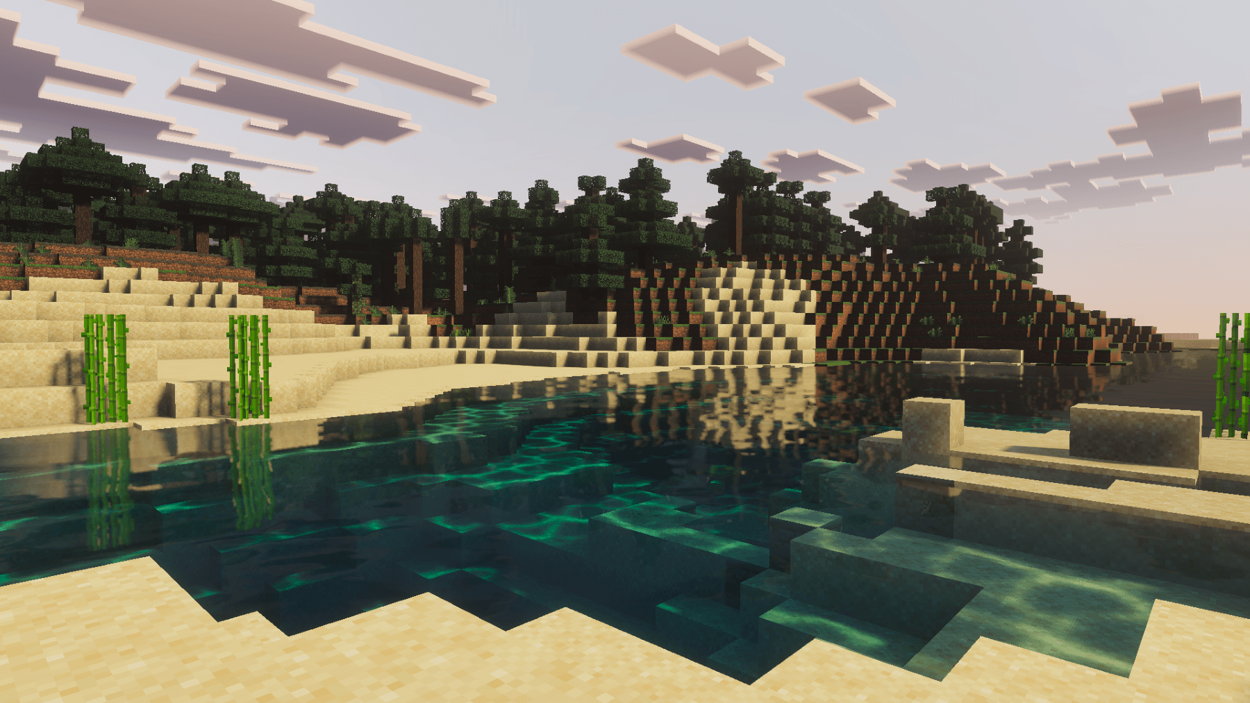 - Clear, reflective water with underwater depth and light rays