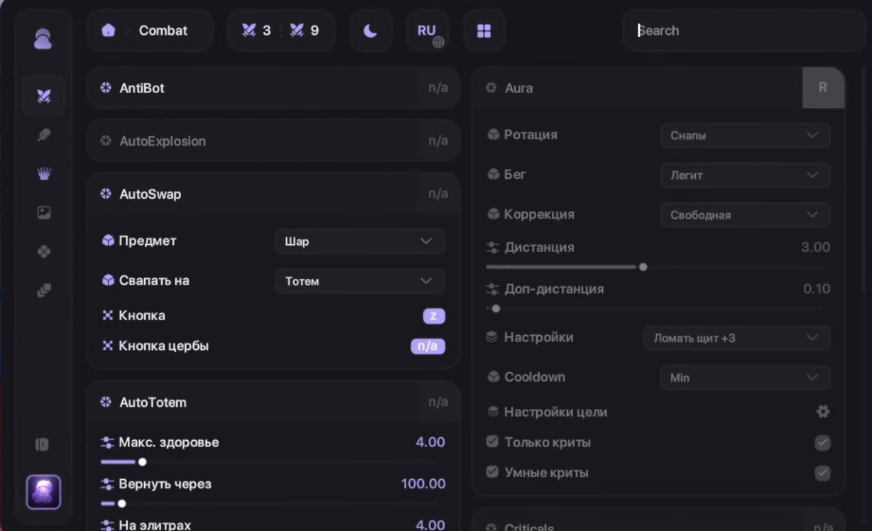 KillAura– Automatically attacks nearby enemiesReach– Extended attack distanceTriggerBot– Attacks when aiming at targetsAutoTotem– Automatically equips totemsCriticals– Improved critical hits