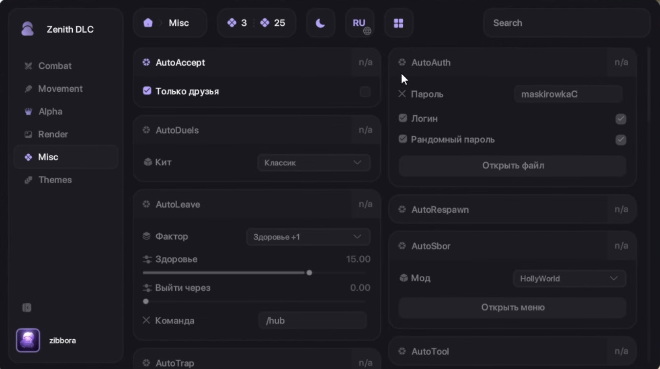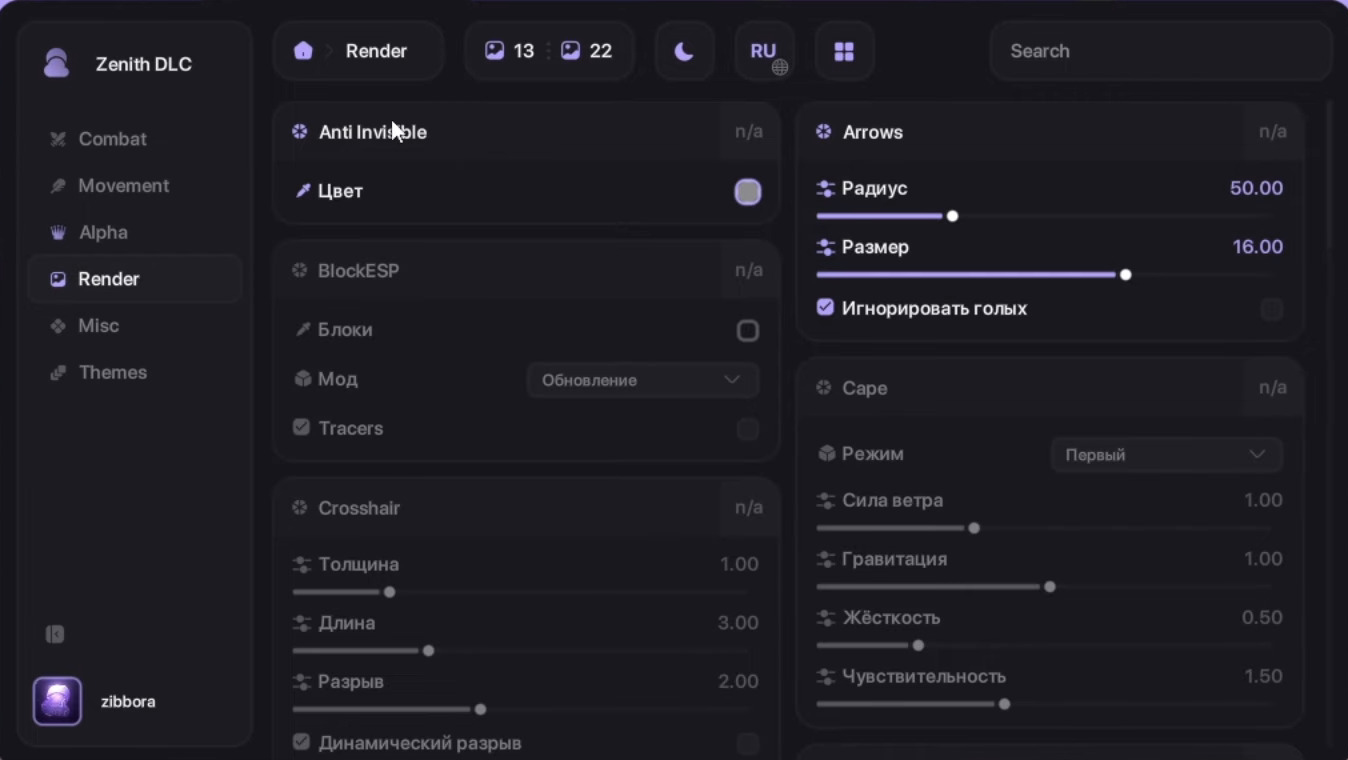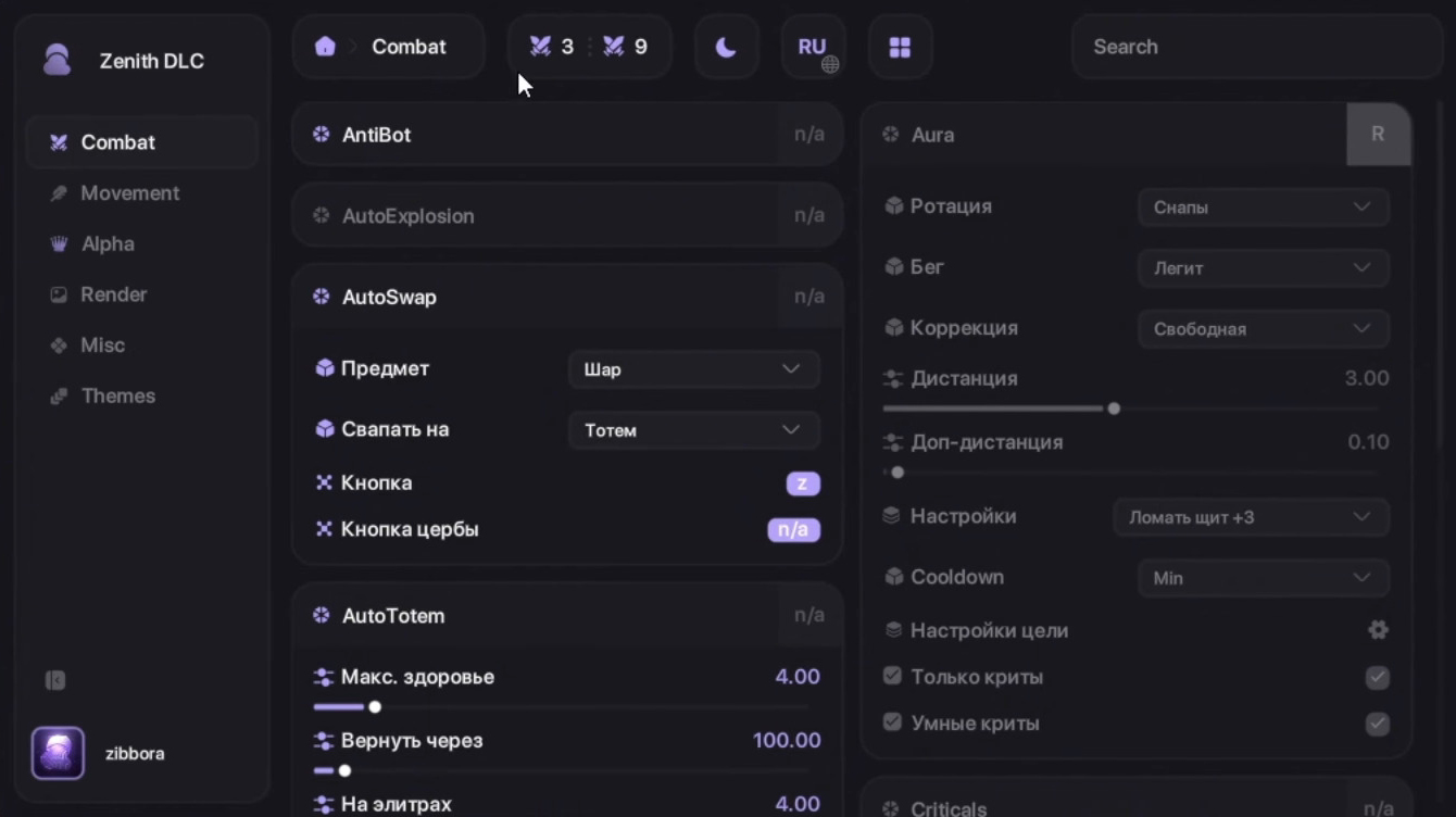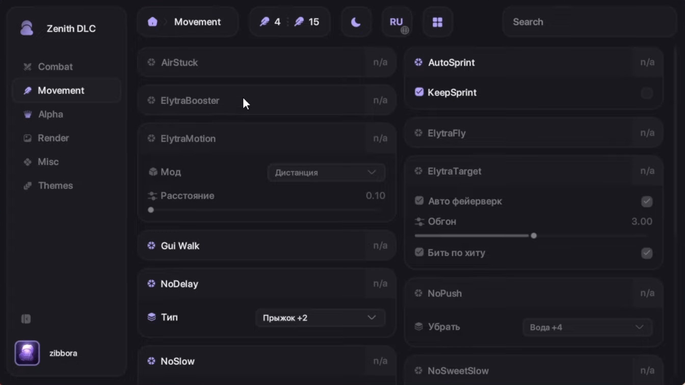 Zenith Client Mod (1.21.4) is a powerful ghost client for Minecraft focused on performance, stability, and advanced modules. It provides a modern and easy-to-use interface with features like KillAura, AutoTotem, TriggerBot, extended Hitboxes, and multiple movement modes to improve PvP gameplay. The client is optimized for smooth performance and includes visual enhancements such as ESP and customizable themes.
